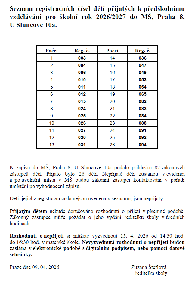 - osobně 17. 3. 2026 nebo 18. 3. 2026 od 13:00 do 17:00 do ředitelny MŠ